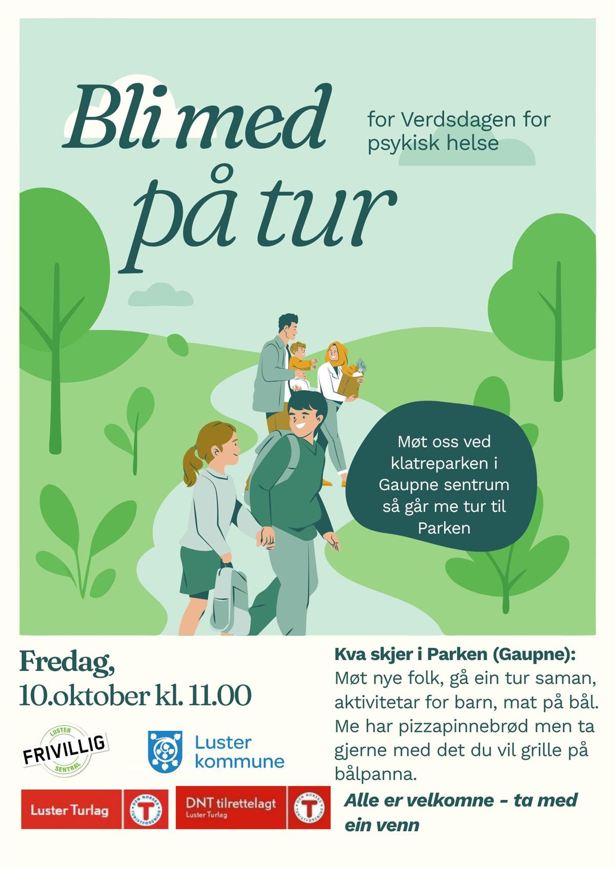 Ta med ein venn og bli med og marker Verdsdagen for psykisk helse saman med Luster Turlag, Barnas Turlag, tilrettelagt friluftsliv (FTU), Luster Frivilligsentral og Luster Kommune.