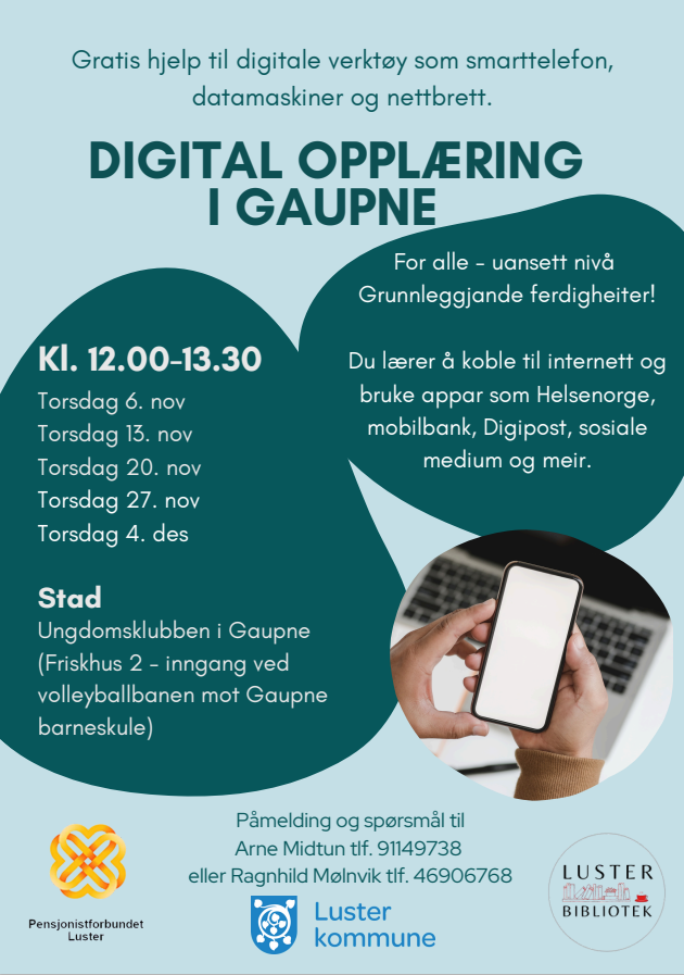 Digital opplæring i Gaupne er eit samarbeid mellom Pensjonistforbundet Luster, Luster bibliotek og Luster kommune.