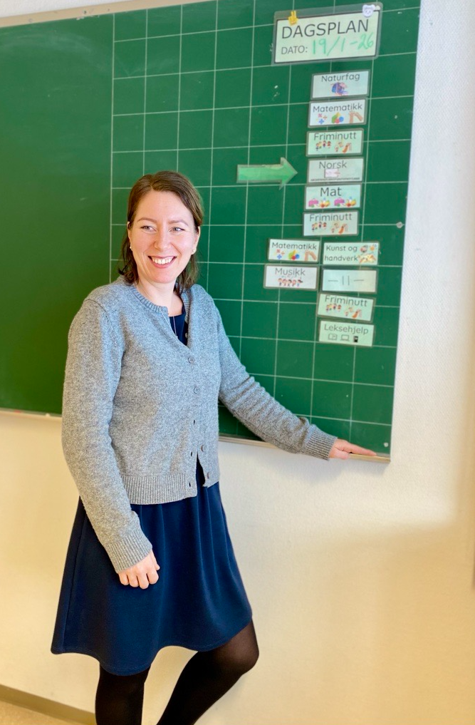 Lærar Katrine Henden Nondal, primus motor i arbeidsgruppa, framfor tavle med dagsplan; eit verktøy for å strukturere skuledagen for elevane.Godkjenninga stadfestar at Hafslo barne- og ungdomsskule driv eit systematisk og målretta arbeid for å sikre god tilrettelegging for elevar med dysleksi og andre språkvanskar.