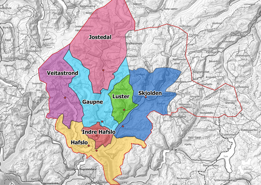 Til høyringa er det lagt ved kartutsnitt syner grensene for dei ulike skulekrinsane. I samsvar med kommunestyrevedtaket av 19. mars 2026 er Hafslo og Solvorn skulekrins slått saman, og grensa mellom Hafslo og Solvorn skulekrins er fjerna.