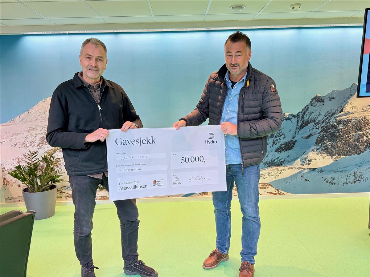 Leiar for innsamlingsaksjonen Geir Arve Sandvik t.h. mottok sjekken på kr 50 000 av kraftverkssjef i Hydro Energi Sogn Per Gullaksen.