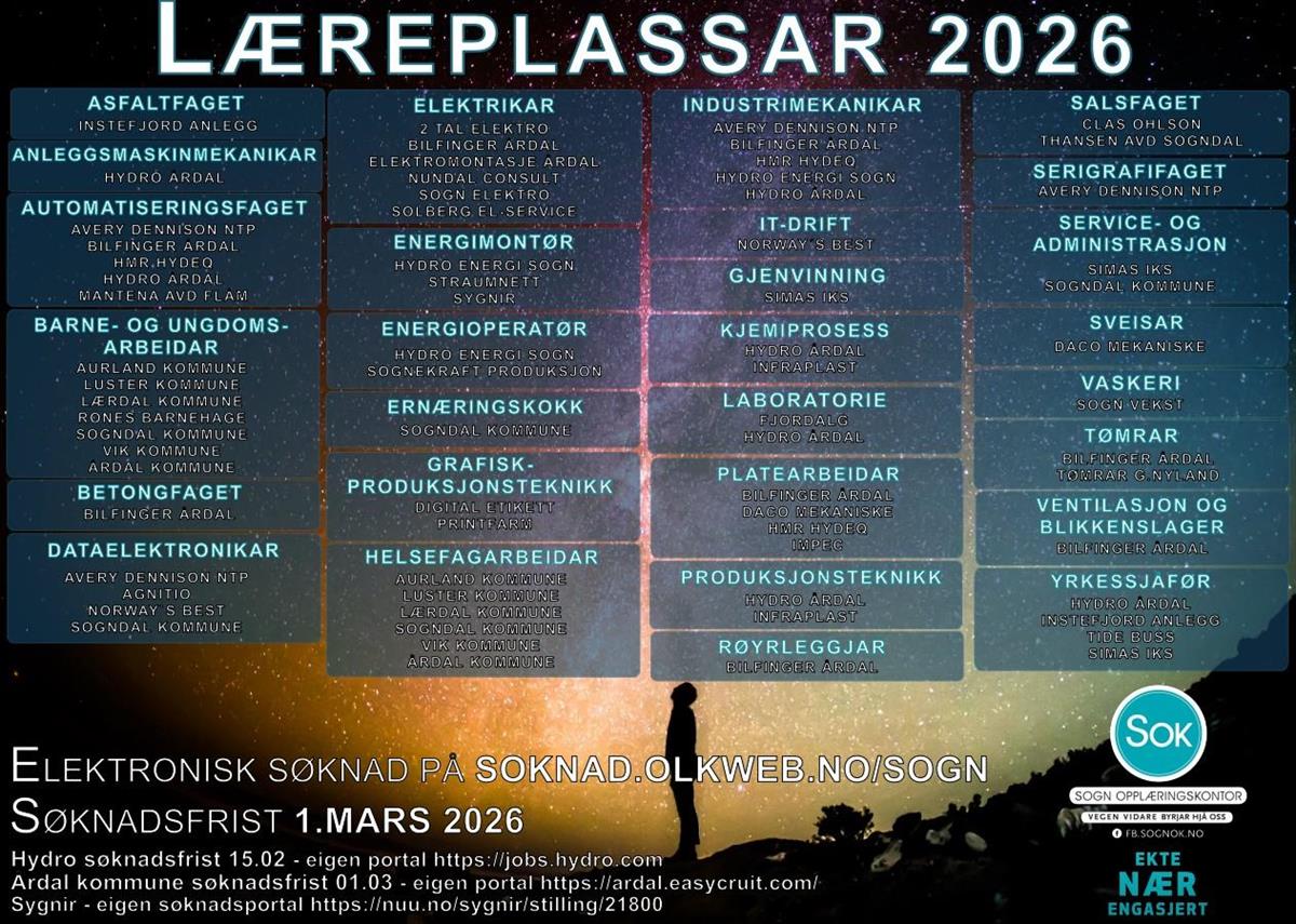 Lærling i Luster kommuneYnskjer du å vere lærling i Luster kommune? Søknadsportalen er no open! Søknadsfrist 1. mars.Luster kommune tilbyr i 2026 lærlingplassar innan helsearbeidarfaget og barne -og ungdomsarbeidarfaget.Søknad skal sendast Sogn opplæringskontor.Søk her