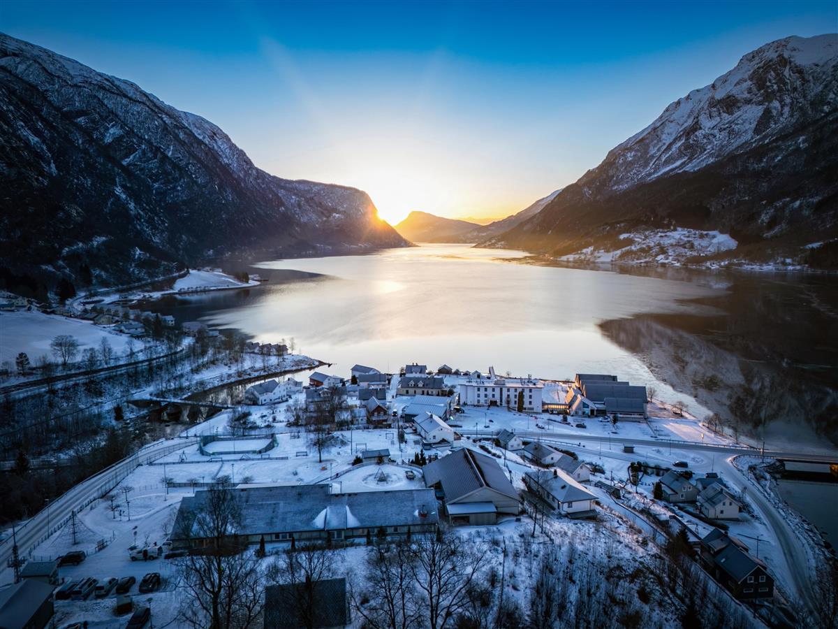 Utsikt ut Lustrafjorden mot Molden med Skjolden og oppvekstsenteret i forgrunn