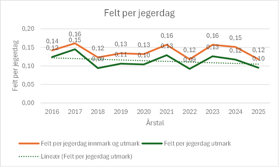 Figur 3: Felt hjort per jegerdag år 2016-2025Felt hjort per jegerdag er slakt nedovergåande. Med betre hjelpemiddel skulle denne vera stigande. Då det skal vera enklare for jegerar å felle hjort med termisk kikkert. Dette er også med å vise at bestanden har flata ut og eller er nedovergåande.