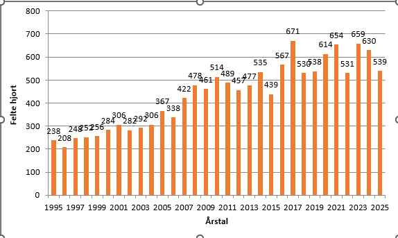 Oversikt over felte dyr for år 1995-2025.Som du ser i figur 1 er det ein nedgang på 91 felte hjort frå 630 felte hjort i 2024. Nedgangen er i hovudsak eldre bukkar og eldre koller. Fellingstalet er på det jamne om ein ser på dei siste 10 åra.