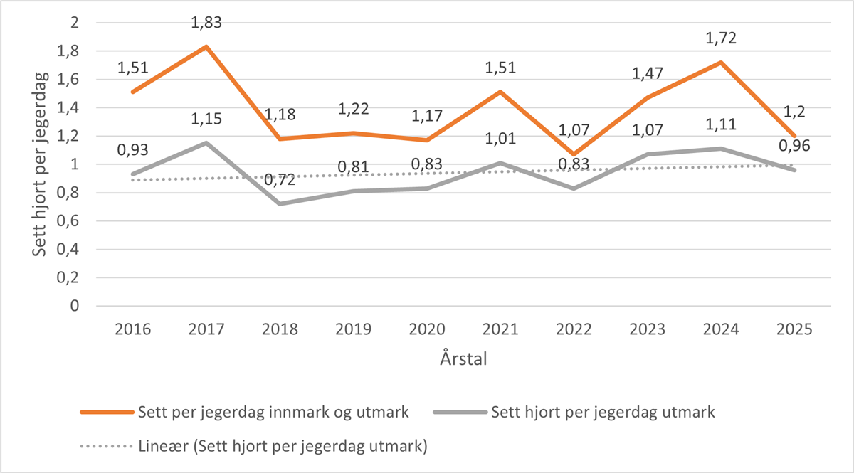 Figur 5: Sett hjort per jegerdag år 2016-2025Sett hjort per jegerdag og sett hjort per jegertime i utmark er stabil dei siste 10 åra. Ein veit at bruk at termisk handkikkert vil påverke sett hjort tala. Men kor mykje er vanskeleg å seie. Men utifrå undersøkingar er det grunn til å tru at dei fleste har tilgang til termisk i dag. Ut ifrå dette er det truleg ein nedgang i stamma med hjort.