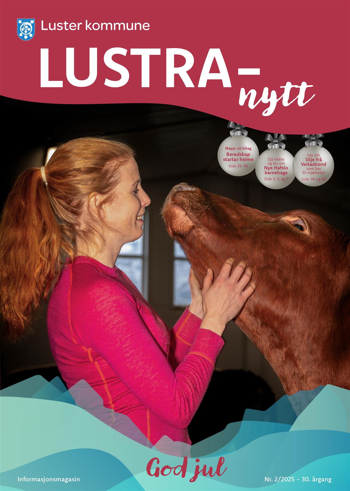 Snart kjem LustranyttNo er årets julenummer av Lustranytt på veg frå trykking og kjem til alle husstandar i Luster kommune og abonnentar i veke 48. Du får små og store glimt frå kommunen – menneske, hendingar og prosjekt som viser breidda i lokalsamfunnet vårt. Eigenberedskap – midtsidebilagetI midten av magasinet finn du eit eige bilag om eigenberedskap, med oversikt over viktige telefonnummer og ei praktisk sjekkliste for kva du bør ha heime. Denne kan du rive ut og ta vare på. To unge bønder – to vegar inn i landbruketI denne utgåva møter du Silje frå Veitastrond, som har teke over familiegarden og driv med mjølkekyr, og Rune frå Skjolden har gått ein annan veg inn i landbruket. Han kjøpte garden for nokre år sidan og satsar på både sau og eple. Nye Hafslo barnehageSjå bilete og les meir om den flotte, nye barnehagen på Hafslo. Eldredagen på FjordstovaMange møtte fram då Oddgeir Bruaset fortalde om “Der ingen skulle tru at nokon kunne bu”. Sjå bilete og les om ein triveleg og inspirerande dag! Gjer det sjølv – raskt og enkeltVisste du at du kan løyse mange oppgåver sjølv på heimesida vår? I Lustranytt får du tips til korleis. Folkehelse i heile kommunenI Lustranytt finn du glimt frå noko av alt som skjer innan folkehelse – frå ungdomsklubb og ferieaktivitetar til Stikk UT! og Stolpejakt. Du kan òg lese om korleis kommunen, frivilligheita og næringslivet samarbeider for å skape Juleglede. Sjå kva som rører seg i oppvekstFleire saker frå skular, barnehagar og oppvekstsenter – både frå administrasjonen og frå kvardagen ute i einingane. Nye ungdomen sitt kommunestyreMøt dei engasjerte ungdommane som no representerer dei unge i Luster i UK. Kjenner du Luster?- 100 meter lang kai - yrkesskulen hadde sine første år her.Dette og mykje meir då du vite når me denne gongen tek turen til Kinsedal, med glimt frå historia og livet der før og no. Kjem i postkassen - veke 48Magasinet er no på veg frå trykkeriet, og i løpet av veke 48 kjem Lustranytt i postkassen til alle husstandar i Luster.Heile magasinet vert òg lagt ut digitalt når utsendinga er i gang.Bestill LustranyttAlle – både i og utanfor kommunen – kan lese magasinet digitalt på heimesida til kommunen. Ynskjer du det tilsendt i papirform?Bestill på post@luster.kommune.no (det er gratis) Vil du sjå tidlegare nummer? Alle nummer frå 2010 ligg ute her.