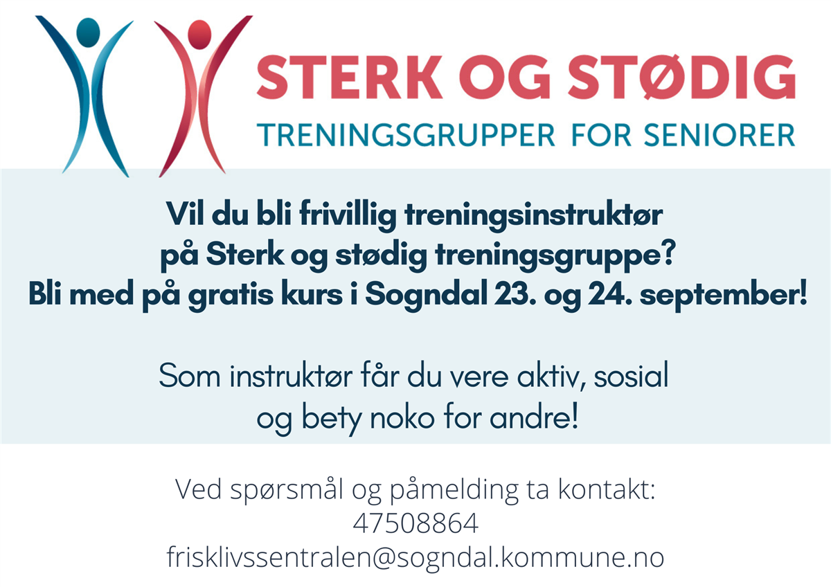 23. og 24. september arrangerast det gratis instruktørkurs i Sogndal, ta kontakt på tlf 47 50 88 64 eller e-post frisklivssentralen@sogndal.kommune.no for å melde deg på eller for å få meir informasjon.