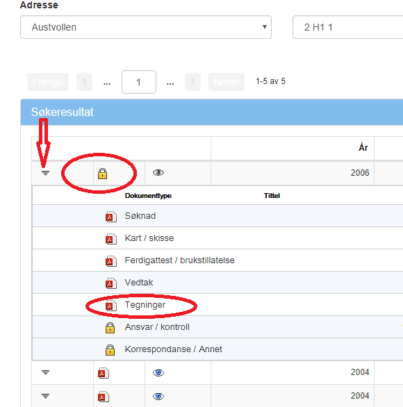 Klikk alltid på pila framfor dokumentet, også om dokumentet er låst. Ofte er det ein del underdokument som er opne og de får den informasjon som faktisk er tilgjengelig, for eksempel teikningar.